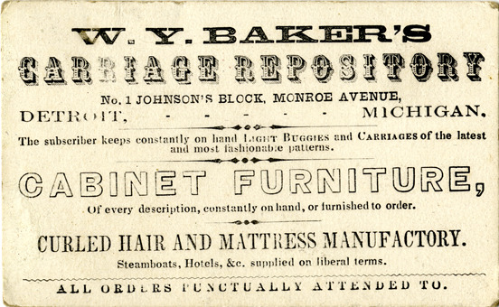 View of a business card for W.Y. Baker. Printed on front: "W.Y. Baker's carriage repository, No. 1 Johnson's Block, Monroe Avenue, Detroit, Michigan. The subscriber keeps constantly on hand light buggies and carriages of the latest and most fashionable patterns. Cabinet furniture of every description, constantly on hand, or furnished to order. Curled hair and mattress manufactory. Steamboats, hotels, &c. supplied on liberal terms. All order punctually attended to."