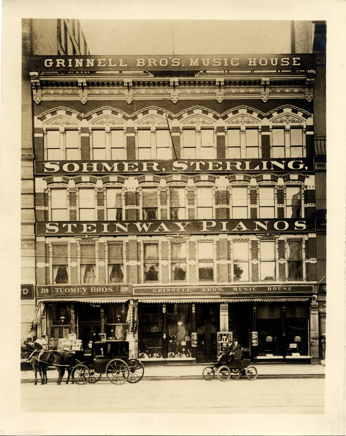View of Grinnell Bros. music store on Woodward Avenue, with horse-drawn carriage and automobile in foreground. Signs on building read: "Grinnell Bros. Music House. Sohmer, Sterling, Steinway pianos." Handwritten on back: "219-221-223 Woodward Ave., 1896-1908."