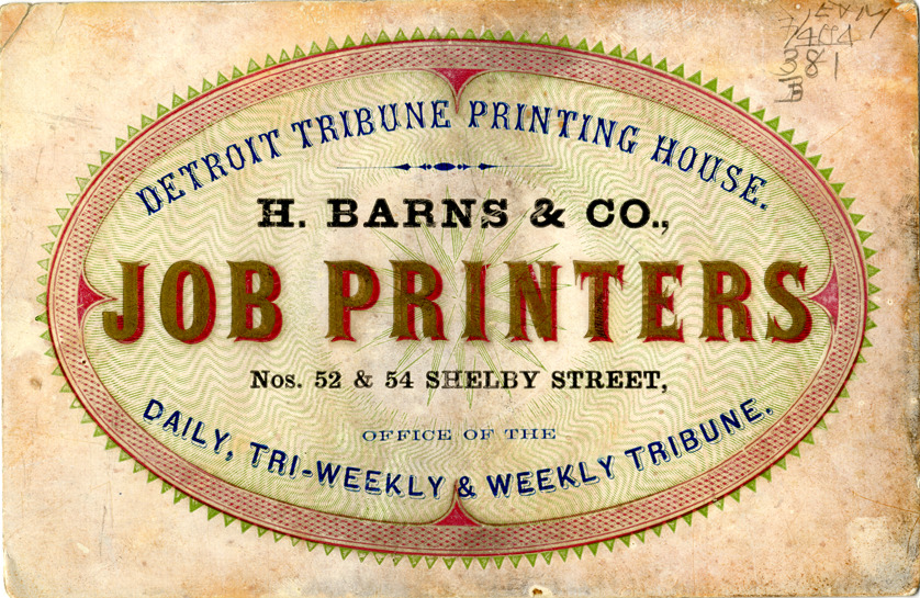 Favorite this☆ Advertising card for H. Barns & Co. Description: View of an advertising card for H. Barns & Co. Printed on front: "H. Barns & Co., job printers. Nos. 52 & 54 Shelby Street, office of the daily, tri-weekly & weekly tribune. Detroit Tribune printing house." Details Resource ID: bh013363 Subject: Printing industry--Michigan--Detroit Advertising cards Date Issued: Unknown year Format: 1 advertising card : col. ; 3.75 x 5.5 in. Member of: Burton Historical Collection Filing Location: E&M 977.4D4 381 B Rights: Physical rights are retained by DPL. Copyright is retained in accordance with U.S. copyright laws.