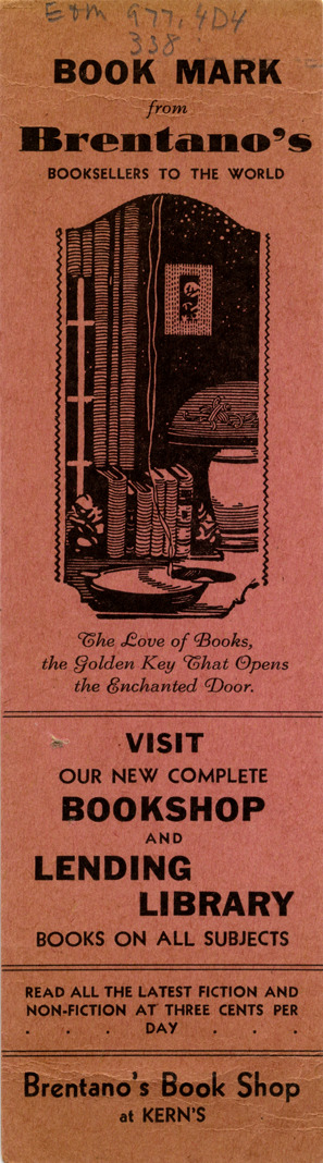 View of a bookmark from Brentano's booksellers. Printed on front: "Book mark from Brentano's, booksellers to the world. The love of books, the golden key that opens the enchanted door. Visit our new complete bookshop and lending library, books on all subjects. Read all the latest fiction and non-fiction at three cents per day. Brentano's Book Shop at Kern's."