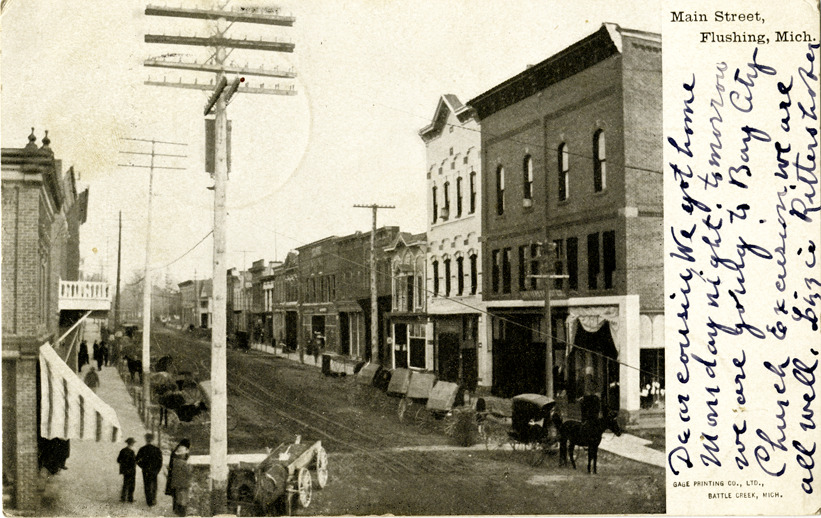 View of commercial buildings along Main Street in Flushing, Michigan. Printed on front: "Main Street, Flushing, Mich. Gage Printing Co., Battle Creek, Mich." Handwritten on front: "Dear cousin, we got home Monday night. Tomorrow we are going to Bay City church excursion. We are all well. Lizzie Rittershofer." Card is postmarked August 16, 1907.