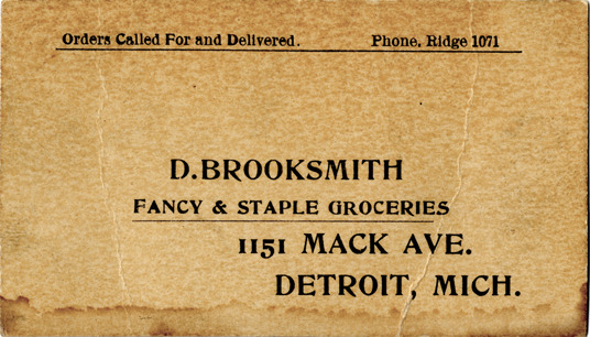 Favorite this☆ Business card for D. Brooksmith Description: View of a business card for D. Brooksmith. Printed on front: "D. Brooksmith, fancy & staple groceries. 1151 Mack Ave., Detroit, Mich. Orders called for and delivered. Phone, Ridge 1071." Details Resource ID: bh013413 Subject: Grocery trade--Michigan--Detroit Grocers--Michigan--Detroit Business cards Date Issued: Unknown year Format: 1 business card ; 2 x 3.5 in. Member of: Burton Historical Collection Filing Location: E&M 977.4D4 381 B Rights: Physical rights are retained by DPL. Copyright is retained in accordance with U.S. copyright laws.