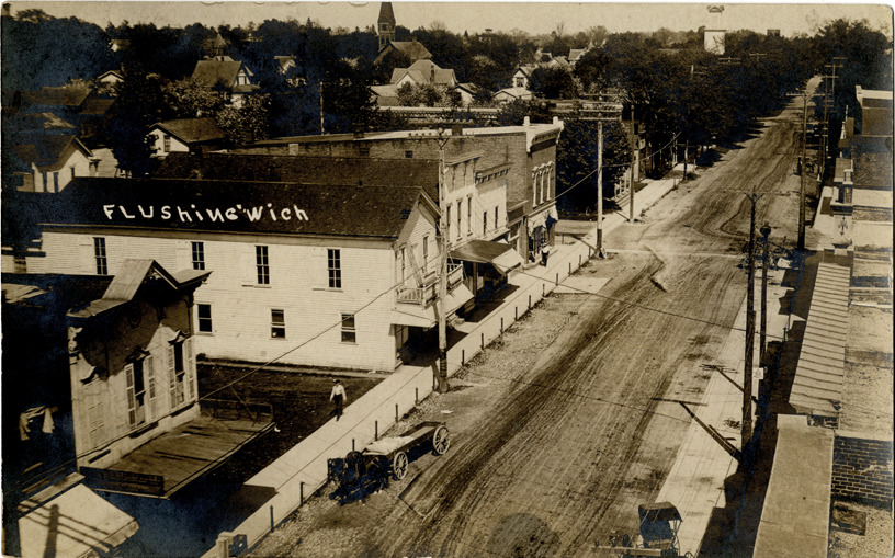 Bird's-eye view of commercial buildings along a street in Flushing, Michigan. Printed on front: "Flushing, Mich." Handwritten on back: "Am here at a political meeting called Sunday but didn't see you. Will send brief soon. F.D." Card is postmarked October 22, 1908.