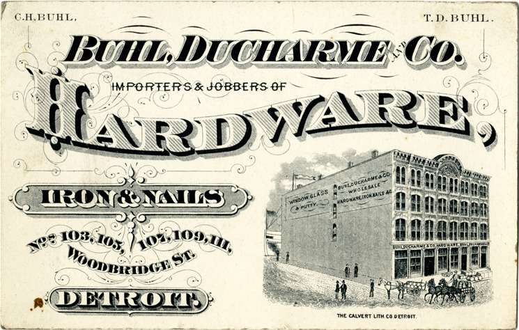 View of an advertising card for Buhl, Ducharme & Co., depicting the building. Printed on front: "Buhl, Ducharme & Co., importers and jobbers of hardware, iron & nails. Nos. 103, 105, 107, 109, 111 Woodbridge St., Detroit. C.H. Buhl, T.D. Buhl. The Calvert Lith. Co., Detroit."