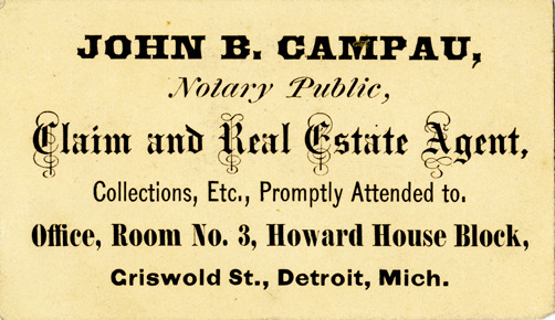 Favorite this☆ Business card for John B. Campau Description: View of a business card for John B. Campau. Printed on front: "John B. Campau, notary public, claim and real estate agent. Collections, etc., promptly attended to. Office, Room no. 3, Howard House Block, Griswold St., Detroit, Mich." Details Resource ID: bh013468 Subject: Real estate agents--Michigan--Detroit Notaries--Michigan--Detroit Business cards Date Issued: Unknown year Format: 1 business card ; 2 x 3.25 in. Member of: Burton Historical Collection Filing Location: E&M 977.4D4 381 C Rights: Physical rights are retained by DPL. Copyright is retained in accordance with U.S. copyright laws.