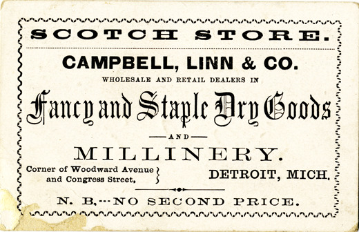 View of a business card for Campbell, Linn & Co. Printed on front: "Campbell, Linn & Co. Wholesale and retail dealers in fancy and staple dry goods and millinery. Scotch store. Corner of Woodward Avenue and Congress Street, Detroit, Michigan. N.B. No second price."