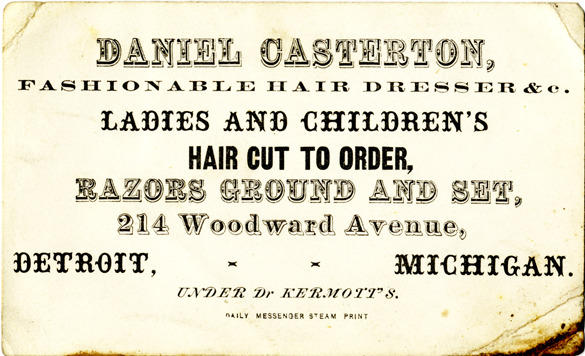 View of a business card for Daniel Casterton. Printed on front: "Daniel Casteron, fashionable hair dresser &c. Ladies and children's hair cut to order, razors ground and set, 214 Woodward Avenue, Detroit, Michigan. Under Dr. Kermott's. Daily messenger steam print."