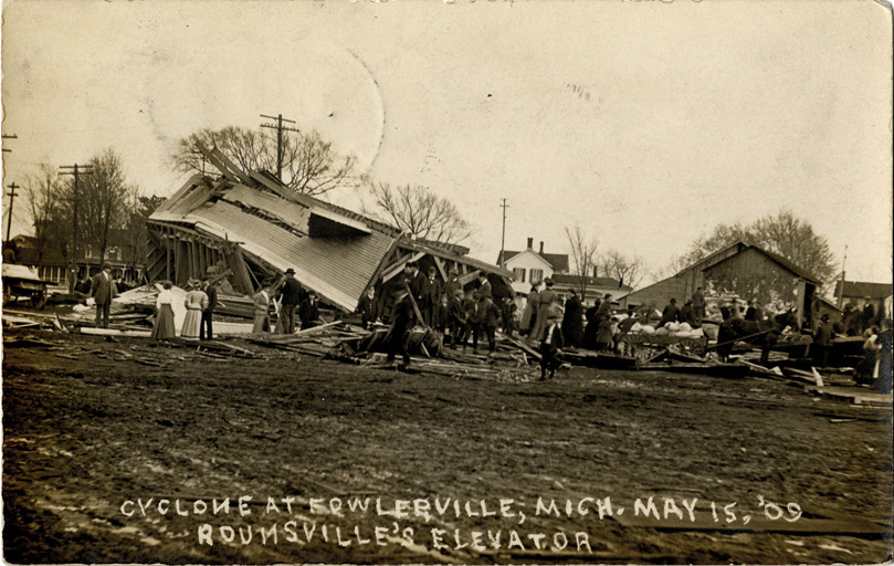 View of onlookers at the site of Rounsville's Elevator, which was damaged by a tornado in Fowlerville, Michigan. Printed on front: "Cyclone at Fowlerville, Mich. May 15, '09. Rounsville's Elevator." Handwritten on back: "June 7, 09. Dear Friend, we received the waist all O.K. and was very thankful for the squash seeds Aunt Minnie said she would write you a letter in a few days we are all well have got our house all cleaned except the kitchen. Is Floyd's school out yet. Warren's is out tomorrow. Asenath."