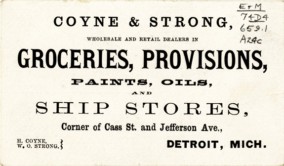 Favorite this☆ Business card for Coyne & Strong Description: View of a business card for Coyne & Strong, wholesale and retail dealers in groceries, provisions, paints, oils and ship stores. Corner of Cass St. and Jefferson Ave., Detroit, Mich. H. Coyne, W.O. Strong." Details Resource ID: bh013500 Subject: Grocery trade--Michigan--Detroit Grocers--Michigan--Detroit Paint industry and trade--Michigan--Detroit Business cards Date Issued: Unknown year Format: 1 business card ; 2.25 x 4 in. Member of: Burton Historical Collection Filing Location: E&M 977.4D4 381 C Rights: Physical rights are retained by DPL. Copyright is retained in accordance with U.S. copyright laws.