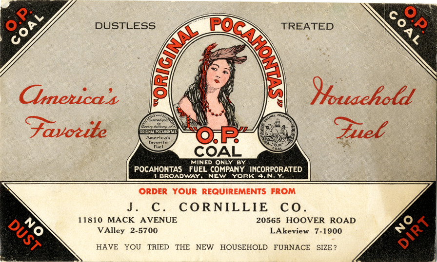 View of an advertising card for J.C. Cornillie Co., depicting Pocahontas. Printed on front: "Order your requirements from J.C. Cornillie Co. 11810 Mack Avenue, Valley 2-5700. 20565 Hoover Road, Lakeview 7-1900. O.P. coal, no dust, no dirt. Dustless, treated. America's favorite household fuel. Original Pocahontas O.P. coat. Mined only by Pocahontas Fuel Company Incorporated. 1 Broadway, New York 4, N.Y. Have you tried the new furnace size?"