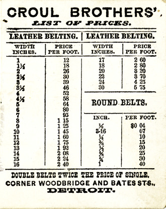 Favorite this☆ Advertising card for Croul Brothers Description: View of an advertising card for Croul Brothers, with price list of belts. Printed on front: "Croul Brothers' list of prices. Leather belting, round belts. Double belts twice the price of single. Corner Woodbridge and Bates Sts., Detroit." Details Resource ID: bh013515 Subject: Belt industry (Clothing)--Michigan--Detroit Advertising cards Date Issued: Unknown year Format: 1 advertising card ; 2.75 x 2.25 in. Member of: Burton Historical Collection Filing Location: E&M 977.4D4 381 C Rights: Physical rights are retained by DPL. Copyright is retained in accordance with U.S. copyright laws.