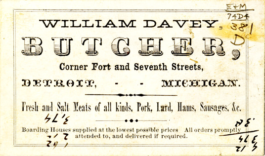 View of a business card for William Davey. Printed on front: "William Davey, butcher. Corner Fort and Seventh Street, Detroit, Michigan. Fresh and salt meats of all kinds, pork, lard, hams, sausages, &c. Boarding houses supplies at the lowest possible prices. All orders promptly attended to, and delivered if required."