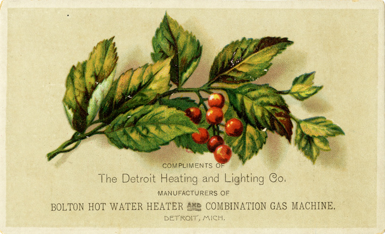 View of an advertising card for the Detroit Heating and Lighting Co., depicting branch with leaves and berries. Printed on front: "Compliments of the Detroit Heating and Lighting Co., manufacturers of Bolton hot water heater and combination gas machine. Detroit, Mich."