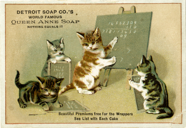 Favorite this☆ Advertising card for Detroit Soap Co. Description: View of an advertising card for the Detroit Soap Co., depicting four kittens and chalkboard. Printed on front: "Detroit Soap Co.'s world famous Queen Anne soap. Nothing equals it. Beautiful premiums free for the wrappers. See list with each cake." Details Resource ID: bh013588 Subject: Soap trade--Michigan--Detroit Advertising--Soap Kittens in art Advertising cards Date Issued: Unknown year Format: 1 advertising card : col. ; 3 x 4.25 in. Member of: Burton Historical Collection Filing Location: E&M 977.4D4 381 D Rights: Physical rights are retained by DPL. Copyright is retained in accordance with U.S. copyright laws.
