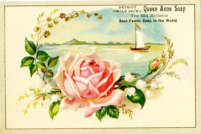 Favorite this☆ Advertising card for Detroit Soap Co. Description: View of an advertising card for the Detroit Soap Co., depicting a rose and a sailboat on lake. Printed on front: "Detroit Soap Co.'s Queen Anne soap. The old reliable. Best family soap in the world." Details Resource ID: bh013597 Subject: Soap trade--Michigan--Detroit Advertising--Soap Roses in art Sailboats in art Advertising cards Date Issued: Unknown year Format: 1 advertising card : col. ; 3 x 4.5 in. Member of: Burton Historical Collection Filing Location: E&M 977.4D4 381 D Rights: Physical rights are retained by DPL. Copyright is retained in accordance with U.S. copyright laws.