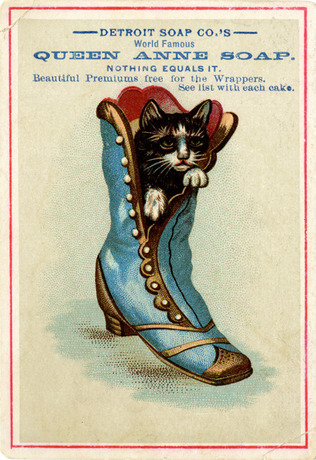 Favorite this☆ Advertising card for Detroit Soap Co. Description: View of an advertising card for the Detroit Soap Co., depicting a cat in a shoe. Printed on front: "Detroit Soap Co.'s world famous Queen Anne soap. Nothing equals it. Beautiful premiums free for the wrappers. See list with each cake." Details Resource ID: bh013600 Subject: Soap trade--Michigan--Detroit Advertising--Soap Cats in advertising Shoes in art Advertising cards Date Issued: Unknown year Format: 1 advertising card : col. ; 4.5 x 3 in. Member of: Burton Historical Collection Filing Location: E&M 977.4D4 381 D Rights: Physical rights are retained by DPL. Copyright is retained in accordance with U.S. copyright laws.