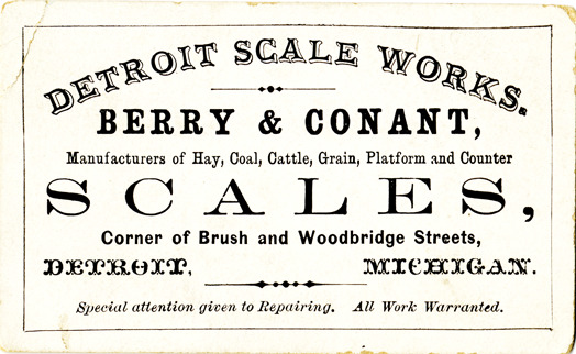 View of a business card for Detroit Scale Works. Printed on front: "Detroit Scale Works. Berry & Conant, manufacturers of hay, coal, cattle, grain, platform and counter scales, corner of Brush and Woodbridge Streets, Detroit, Michigan. Special attention given to repairing. All work warranted."