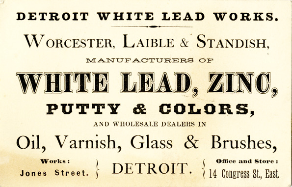 View of a business card for the Detroit White Lead Works. Printed on front: "Detroit White Lead Works. Worcester, Laible & Standish. Manufacturers of white lead, zinc, putty & Colors, and wholesale dealers in oil, varnish, glass & brushes. Works: Jones Street. Office and store: 14 Congress St. East, Detroit."