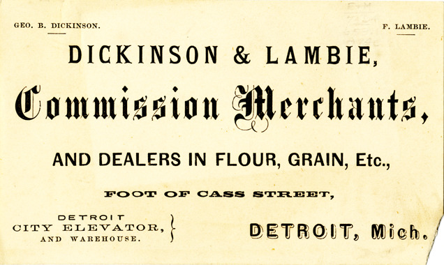 Favorite this☆ Business card for Dickinson & Lambie Description: View of a business card for Dickinson & Lambie. Printed on front: "Dickinson & Lambie, commission merchants, and dealers in flour, grain, etc., foot of Cass Street, Detroit, Mich. Detroit City Elevator and warehouse. Geo. B. Dickinson, F. Lambie." Details Resource ID: bh013641 Subject: Commission merchants--Michigan--Detroit Grain trade--Michigan--Detroit Business cards Date Issued: Unknown year Format: 1 business card ; 2.5 x 4.25 in. Member of: Burton Historical Collection Filing Location: E&M 977.4D4 381 D Rights: Physical rights are retained by DPL. Copyright is retained in accordance with U.S. copyright laws.