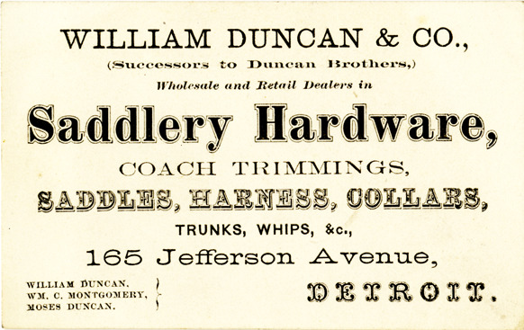 View of a business card for William Duncan & Co. Printed on front: "William Duncan & Co., successors to Duncan Brothers, wholesale and retail dealers in saddlery hardware, coach trimmings, saddles, harness, collars, trunks, whips, &c., 165 Jefferson Avenue, Detroit. William Duncan, Wm. C. Montgomery, Moses Duncan."