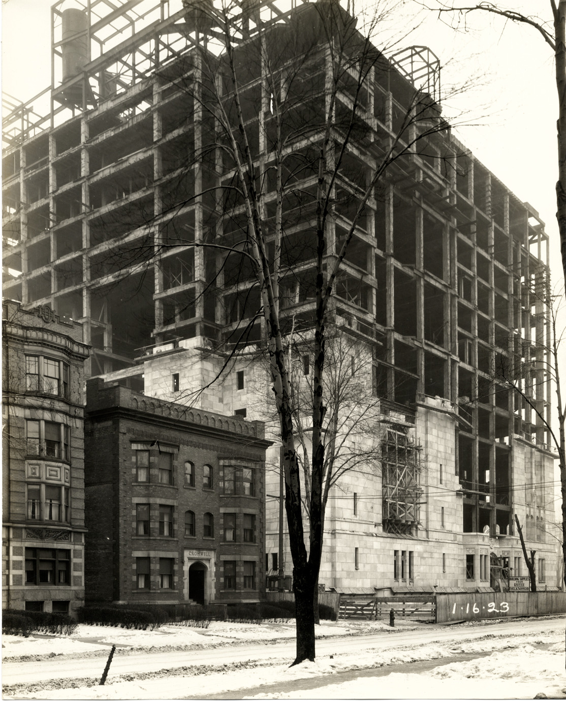 View of the Masonic Temple in Detroit, Michigan during construction, showing structural framework and partially completed facade. Cromwell apartment building on left. Printed on front: "1-16-23." Stamped on back: "J.W. Hughes, photographer. 21 Milwaukee Avenue West. Northway 3145. Detroit, Mich. Your negatives safely filed for re-orders."