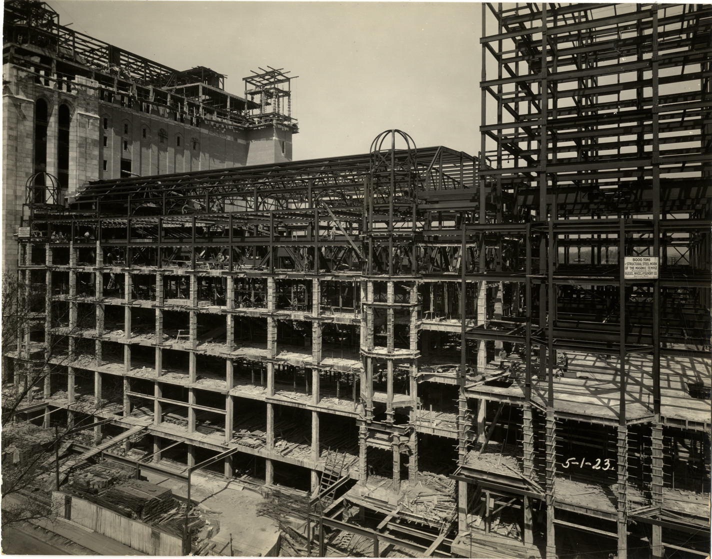 View of the Masonic Temple in Detroit, Michigan during construction, showing structural framework. Printed on front: "5-1-23." Stamped on back: "J.W. Hughes, photographer. 21 Milwaukee Avenue West. Northway 3145. Detroit, Mich. Your negatives safely filed for re-orders."