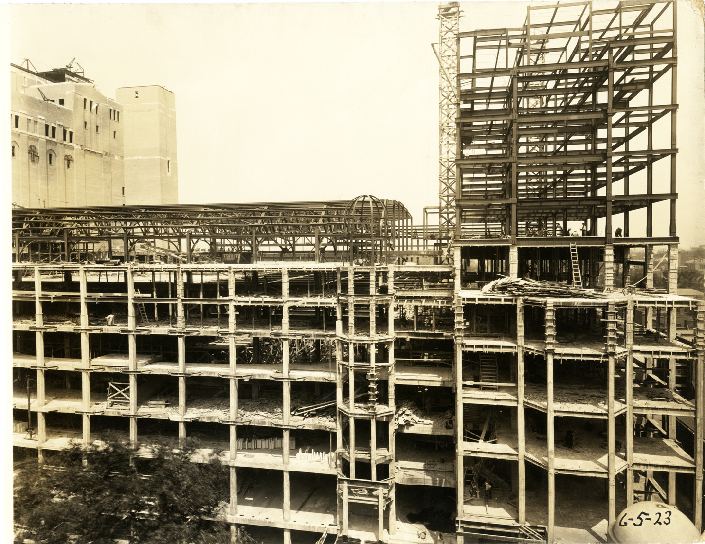 View of the Masonic Temple in Detroit, Michigan during construction, showing structural framework. Printed on front: "6-5-23." Stamped on back: "J.W. Hughes, photographer. 21 Milwaukee Avenue West. Northway 3145. Detroit, Mich. Your negatives safely filed for re-orders."