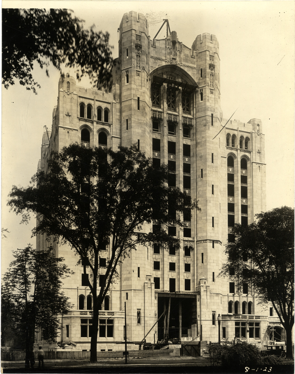Favorite this☆ Masonic Temple under construction Description: View of the Masonic Temple in Detroit, Michigan during construction. Printed on front: "8-1-23." Stamped on back: "J.W. Hughes, photographer. 21 Milwaukee Avenue West. Northway 3145. Detroit, Mich. Your negatives safely filed for re-orders." Details Resource ID: bh013707 Creator: Hughes, J.W. Subject: Masonic Temple (Detroit, Mich.) Freemasons--Michigan--Detroit--Buildings--Design and construction Mason, George D. Photographers--Michigan--Detroit Photographic prints Date Issued: 1923-08-01 Format: 1 photographic print mounted on fabric ; 9.5 x 7.5 in. Member of: Burton Historical Collection Filing Location: D/Buildings-Masonic Temple Rights: Physical rights are retained by DPL. Copyright is retained in accordance with U.S. copyright laws.