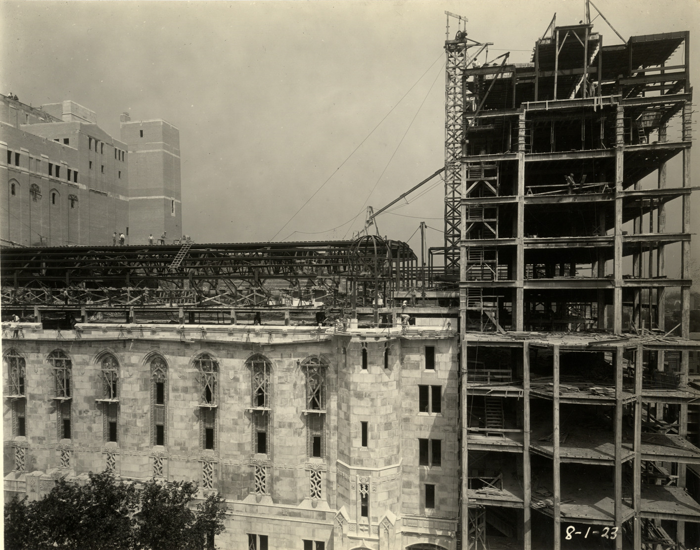View of the Masonic Temple in Detroit, Michigan during construction, showing structural framework and partially completed facade. Printed on front: "8-1-23." Stamped on back: "J.W. Hughes, photographer. 21 Milwaukee Avenue West. Northway 3145. Detroit, Mich. Your negatives safely filed for re-orders."