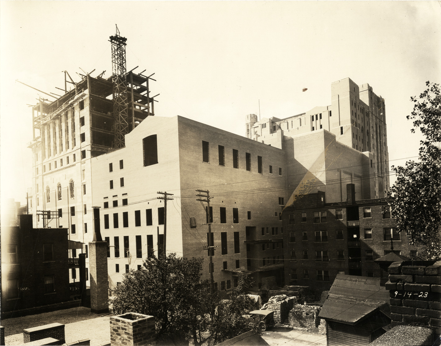 View of the Masonic Temple in Detroit, Michigan during construction, showing partially completed facade. Stacks of building materials are visible. Printed on front: "9-14-23." Stamped on back: "J.W. Hughes, photographer. 21 Milwaukee Avenue West. Northway 3145. Detroit, Mich. Your negatives safely filed for re-orders."