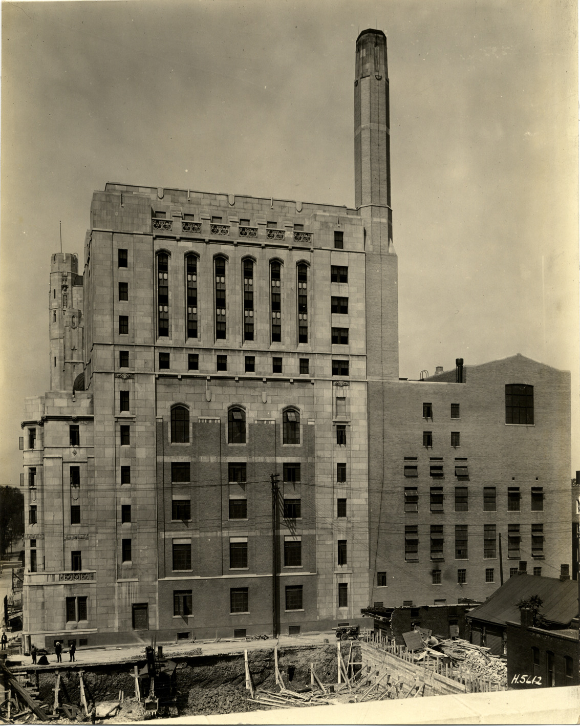 View of the Masonic Temple in Detroit, Michigan during construction, showing excavation of a foundation in foreground. Stamped on back: "J.W. Hughes, photographer. 21 Milwaukee Avenue West. Northway 3145. Detroit, Mich. Your negatives safely filed for re-orders." Handwritten on back: "June 15, 1925."