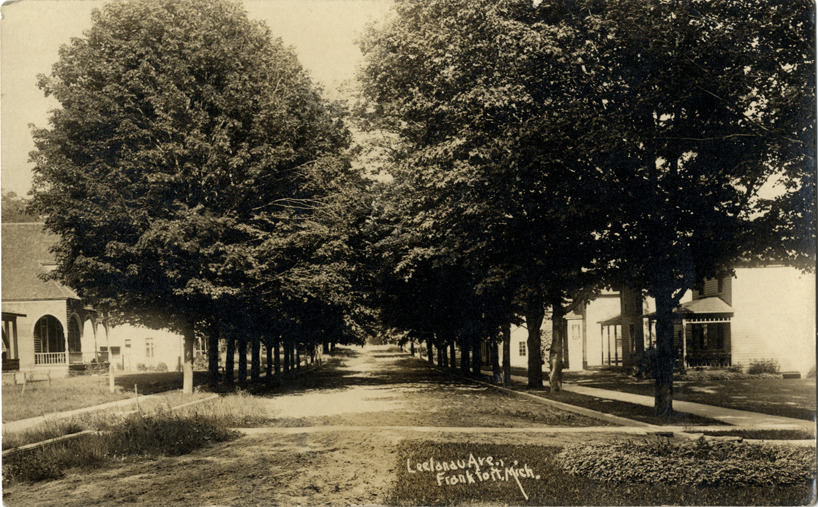 View of tree-lined Leelanau Ave. in Frankfort, Michigan. Printed on front: "Leelanau Ave., Frankfort, Mich." Handwritten on back: "Dear Parents, We arrived here O.K. had no trouble 3 cars drove up here about 300 miles now don't worry love to you all. Grace & Will." Card is postmarked August 25, 1920.