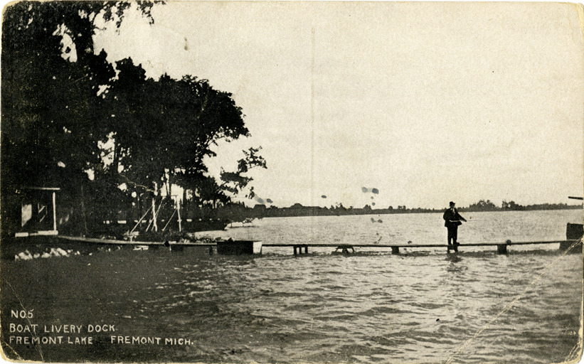 View of the boat dock at Fremont Lake in Fremont, Michigan. Printed on front: "No. 5. Boat livery dock. Fremont Lake, Fremont, Michigan." Printed on back: "Pub. by Will P. Canaan Co., Grand Rapids, Mich." Handwritten on back: "9-1-10. Dear Brother, Having a great time here. Muskegon tomorrow. Yours, Monte." Card is postmarked September 1, 1910.