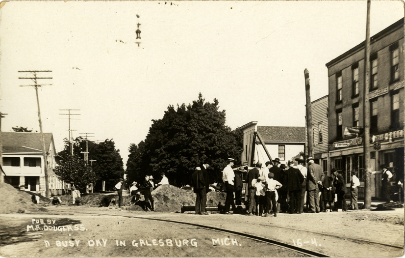 Favorite this☆ Road construction in Galesburg, Michigan Description: View of onlookers watching road construction in Galesburg Michigan. Printed on front: "A busy day in Galesburg, Mich. Pub. by M.A. Douglass." Details Resource ID: bh013764 Subject: Streets--Michigan--Galesburg Roads--Michigan--Galesburg--Design and construction Commercial buildings--Michigan--Galesburg Photographic prints Postcards Publisher: M.A. Douglass Date Issued: Unknown year Format: 1 postcard ; 3.5 x 5.5 in. Member of: Burton Historical Collection Filing Location: M/Localities-Galesburg Rights: Physical rights are retained by DPL. Copyright is retained in accordance with U.S. copyright laws.