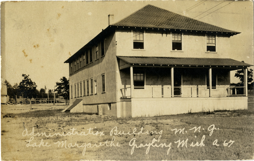 View of the Michigan National Guard Administration Building at Lake Margarethe in Grayling, Michigan. Printed on front: "Administration Building M.N.G., Lake Margarethe, Grayling, Mich. A67." Handwritten on back: "Dear Ma, Will write in a few minutes per letter. It has been raining most of the time. See you soon? Bob." Card is postmarked August 9, 1925.