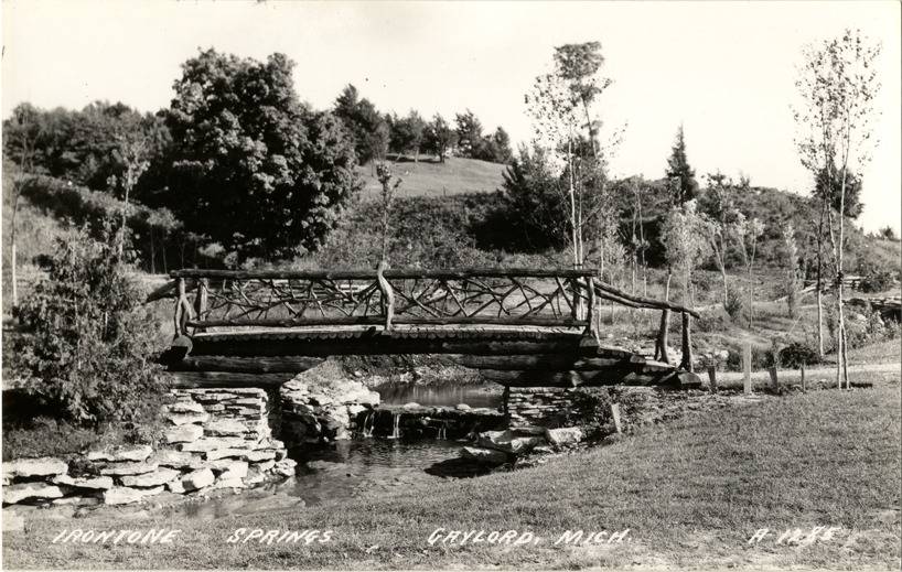 Favorite this☆ Irontone Springs, Gaylord, Michigan Description: View of a rustic wooden bridge over Irontone Springs in Gaylord, Michigan. Printed on front: "Irontone Springs, Gaylord, Mich." Printed on back: "All rights reserved. The L.L. Cook Co., Milwaukee." Details Resource ID: bh013769 Subject: Rivers--Michigan--Gaylord Wooden bridges--Michigan--Gaylord Photographic prints Postcards Publisher: L.L. Cook Co. Date Issued: Unknown year Format: 1 postcard ; 3.5 x 5.5 in. Member of: Burton Historical Collection Filing Location: M/Localities-Gaylord Rights: Physical rights are retained by DPL. Copyright is retained in accordance with U.S. copyright laws.