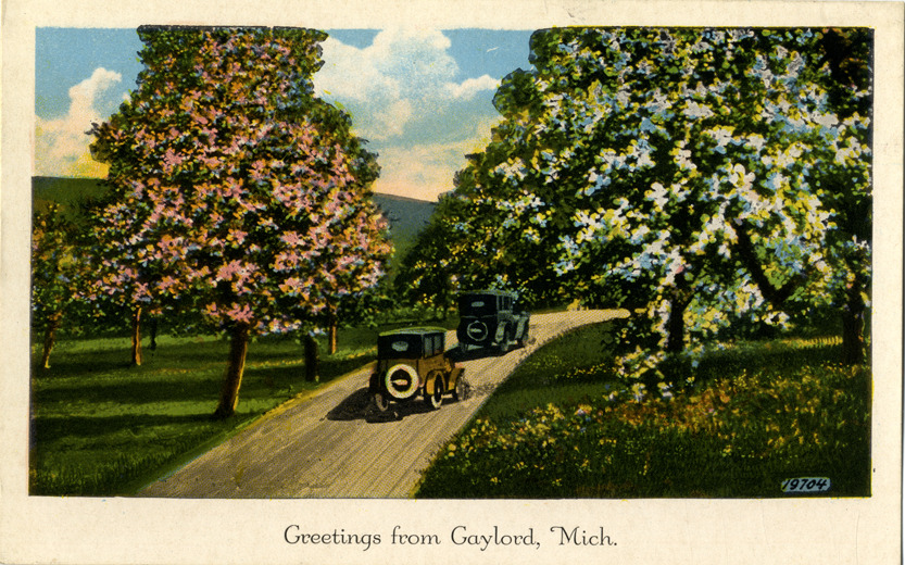 View of two cars traveling on a rural road lined with flowering trees in Gaylord, Michigan. Printed on front: "Greetings from Gaylord, Mich." Printed on back: "Series 1247, landscapes, 24 designs."