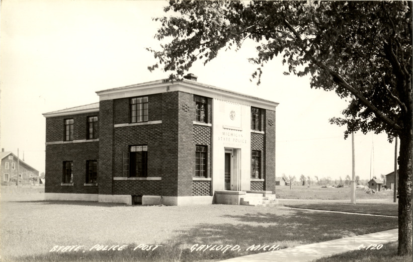Favorite this☆ Michigan State Police District No. 7 building, Gaylord, Michigan Description: View of the Michigan State Police District no. 7 building in Gaylord, Michigan. Printed on front: "State Police Post, Gaylord, Mich." Details Resource ID: bh013773 Subject: Michigan State Police--Buildings Police stations--Michigan--Gaylord Photographic prints Postcards Date Issued: Unknown year Format: 1 postcard ; 3.5 x 5.5 in. Member of: Burton Historical Collection Filing Location: M/Localities-Gaylord Rights: Physical rights are retained by DPL. Copyright is retained in accordance with U.S. copyright laws.