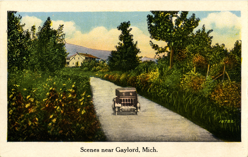 Favorite this☆ Automobile traveling on rural road, Gaylord, Michigan Description: View of a car traveling on a rural road in Gaylord, Michigan. Printed on front: "Scenes near Gaylord, Mich." Printed on back: "Series 1247, landscapes, 24 designs." Details Resource ID: bh013779 Subject: Automobiles--Michigan--Gaylord Rural roads--Michigan--Gaylord Postcards Publisher: Miller Art Co. Date Issued: Unknown year Format: 1 postcard : col. ; 3.5 x 5.5 in. Member of: Burton Historical Collection Filing Location: M/Localities-Gaylord Rights: Physical rights are retained by DPL. Copyright is retained in accordance with U.S. copyright laws.