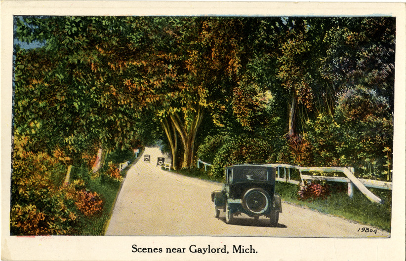 Favorite this☆ Automobiles traveling on rural road, Gaylord, Michigan Description: View of a cars traveling on a rural road in Gaylord, Michigan. Printed on front: "Scenes near Gaylord, Mich." Printed on back: "Series 1247, landscapes, 24 designs." Details Resource ID: bh013780 Subject: Automobiles--Michigan--Gaylord Rural roads--Michigan--Gaylord Postcards Publisher: Miller Art Co. Date Issued: Unknown year Format: 1 postcard : col. ; 3.5 x 5.5 in. Member of: Burton Historical Collection Filing Location: M/Localities-Gaylord Rights: Physical rights are retained by DPL. Copyright is retained in accordance with U.S. copyright laws.