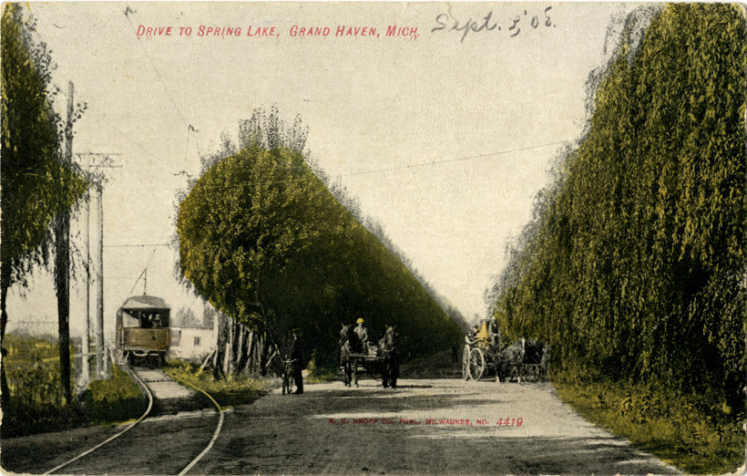 View of horse-drawn wagons and a streetcar on a rural road leading to Spring Lake at Grand Haven, Michigan. Printed on front: "Drive to Spring Lake, Grand Haven, Michigan. E.C. Kropp Co. publ., Milwaukee, no. 4419." Handwritten on front: "Sept. 3 '08." Handwritten on back: "Am enjoying myself immensely. Hope you are too. Frances." Card is postmarked September 3.