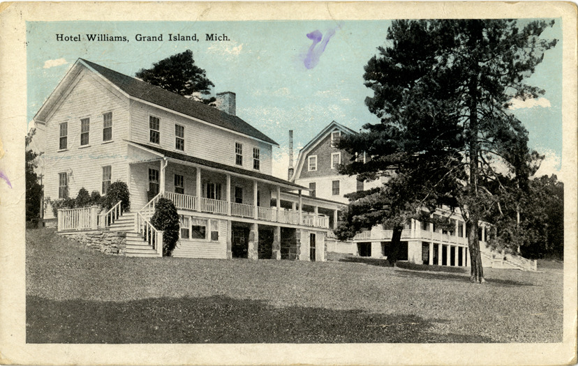 View of the Hotel Williams on Grand Island, Michigan. Printed on front: "Hotel Williams, Grand Island, Mich." Printed on back: "Pub. by H.A. Lawrence, Munising, Mich." Handwritten on back: "Dear Jean, Nothing in this town but sawdust and vacant houses. Have had a fine trip and good weather. Hope to see you soon with love [undecipherable]. 6/11/27." Card is postmarked June 11, 1927.