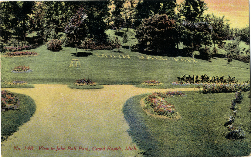 View of the gardens at John Ball Park in Grand Rapids, Michigan. "John Ball Park" is spelled out in flowers on lawn in background. Printed on front: "No. 148. View in John Ball Park, Grand Rapids, Mich." Printed on back: "Published by Will P. Canaan Co., Grand Rapids, Mich." Handwritten on back: "4-27-11. Our train due in Belding in ten minutes. Weather very am feeling fine. Hope you will have house done when I arrive." Card is postmarked 1911.