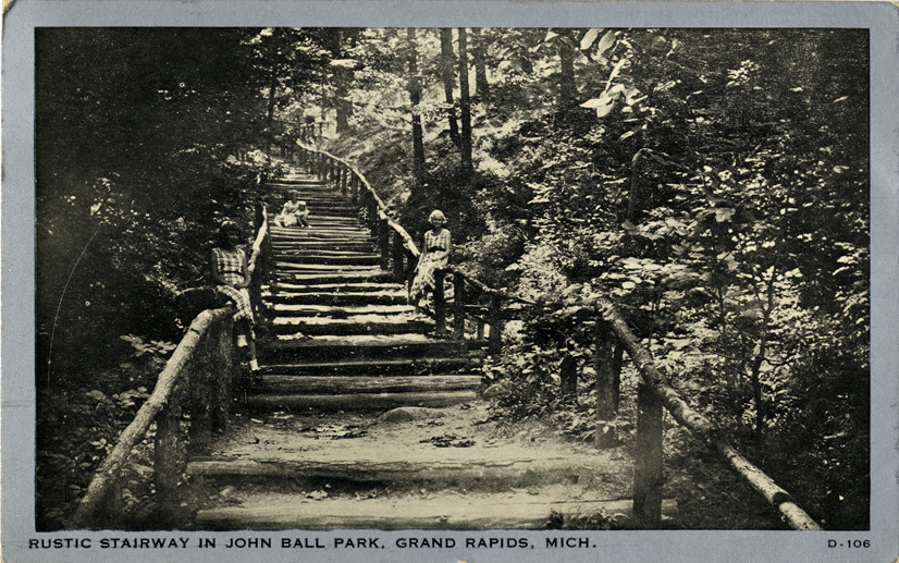 View of two women and a child on a rustic wooden stairway at John Ball Park in Grand Rapids, Michigan. Printed on front: "Rustic stairway in John Ball Park, Grand Rapids, Mich." Printed on back: "Mfd. by Wayne Paper Box & Prtg. Corp., Fort Wayne, Ind." Handwritten on back: "Dear Dinger, I went to a circus. And I went to Lake Mich. and saw Mary Anne. Love, Betsy." Card is postmarked July 8, 1937.
