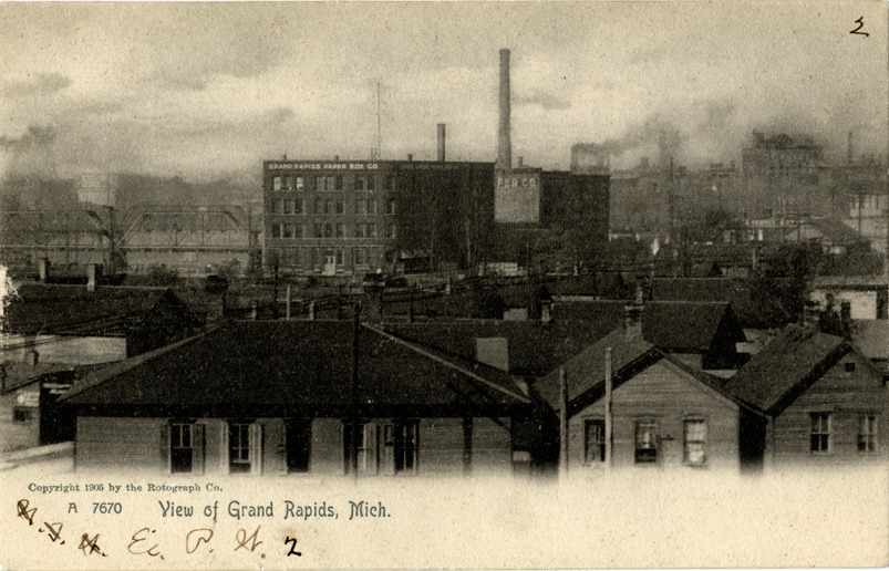 Bird's-eye view of Grand Rapids, Michigan, showing Grand Rapids Paper Box Co. factory in background. Printed on front: "A 7670. View of Grand Rapids, Mich. Copyright 1905 by the Rotograph Co." Handwritten on front: "E.P.W. 2." Printed on back: "The Rotograph Co., N.Y., City, (Germany)."