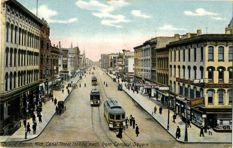 View of streetcars and commercial buildings on Canal St. in Grand Rapids, Michigan. Printed on front: "Grand Rapids, Mich. Canal Street, looking north, from Campau Square." Printed on back: "The Hugh C. Leighton Co., manufacturers, Portland, Me., U.S.A. Made in Germany 8875." Handwritten on back: "Don't suppose this looks natural. Does it? Mr. D." Card is postmarked March 6, 1910.