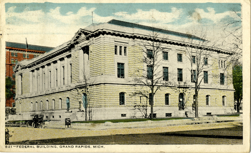 View of the Federal Building in Grand Rapids, Michigan. Printed on front: "Federal Building, Grand Rapids, Mich." Printed on back: "Published by American Autochrome Co., Chicago." Handwritten on back: "Have nothing else to do sitting in waiting room waiting for train. Sam." Card is postmarked February 6, 1922.