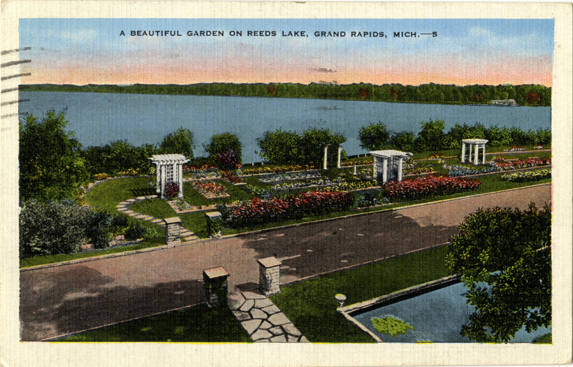 View of a garden on Hodenpyl Dr. at Reeds Lake in Grand Rapids, Michigan. Printed on front: "A beautiful garden on Reeds Lake, Grand Rapids, Mich." Printed on back: "This beautiful garden on Hodenpyl Drive around Reeds Lake has long been an attraction to visitors. Made in U.S.A. by E.C. Kropp Co., Milwaukee, Wis." Handwritten on back: "Dear Mother, I went swimming two times. Send me the package please. Betsy." Card is postmarked July 16, 1937.