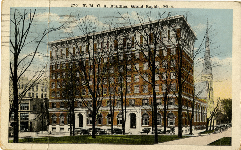 View of the Y.M.C.A. building in Grand Rapids, Michigan. Printed on front: "270. Y.M.C.A. building, Grand Rapids, Mich." Printed on back: "Pub. by the Heyboer Stationery Co." Handwritten on back: "Dear Aunt, I am in Grand Rapids in the Eagle Hotel which we [undecipherable] in tonight. Will have our exam tomorrow and tell whether we will go further or not. We will have our uniforms in two days. Hope I pass. Will write tomorrow. Love, Cliff." Card is postmarked January 10, 1918.