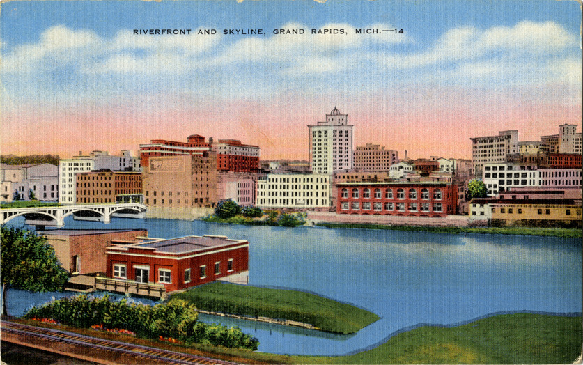 View of the riverfront and skyline along the Grand River in Grand Rapids, Michigan. Printed on front: "Riverfront and skyline, Grand Rapids, Mich. 14." Printed on back: "This is a view showing the riverfront and skyline across Grand River from which the city makes its name. Made in U.S.A. by E.C. Kropp Co., Milwaukee, Wis. (EJL)."
